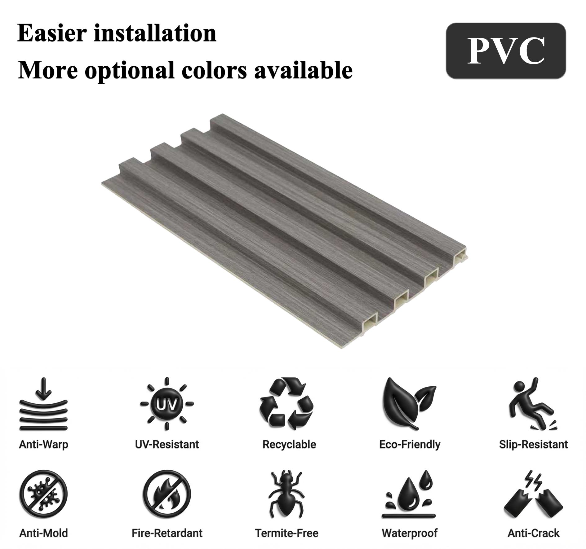 Gestalten Sie Ihre Außenbereiche und Fassaden nahtlos neu mit unserem gerillte, wasserdichte PVC-Wandverkleidung. Es istmarkante gerillte Textur Verleiht unterschiedlichsten Umgebungen Tiefe und Eleganz – von Wohnhäusern bis hin zu Geschäftsräumen. Diese PVC-Fassade ist für den Einsatz unter allen Witterungsbedingungen konzipiert, wasserabweisend, UV-beständig und temperaturunempfindlich. Damit eignet sie sich perfekt für Außenbereiche wie Terrassen, Balkone oder Feuchträume. Leicht und dennoch robust, ermöglicht sie eine einfache Montage und minimalen Wartungsaufwand, sodass Sie sich keine ständigen Instandhaltungsarbeiten machen müssen. Verbinden Sie ästhetischen Charme mit dauerhafter Leistung – lassen Sie sich von unserergerillte PVC-WandverkleidungVerleihen Sie Ihrem Raum einen neuen Stil und eine längere Lebensdauer.